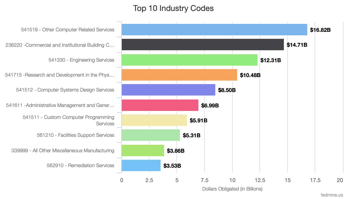 The top NAICS codes follow a similar pattern as the top categories, and include Computer Related Services, Construction, Engineering, R&D, and Professional Services.