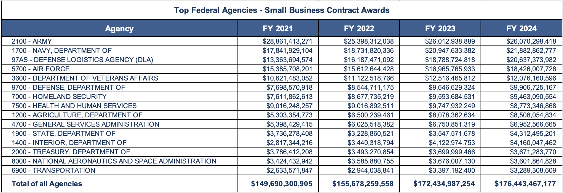 In addition to the defense agencies, we see the Dept of Veterans Affairs, Homeland Security, Health and Human Services, Agriculture, and GSA in the top ten agencies awarding contracts to small businesses in FY 24.