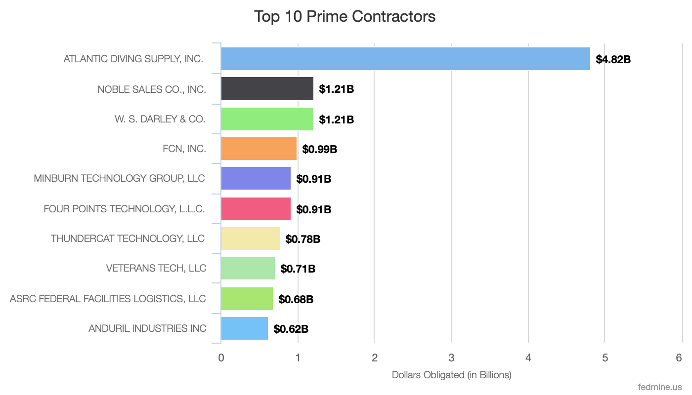 It comes as no surprise that Atlantic Diving Supply was the top small business contractor at $4.8B in federal contracts, making up 2.7% of the total amount awarded as small business contracts. Noble Sales, WS Darley, FCN, and Minburn Technology group make up the remaining top 5 companies.