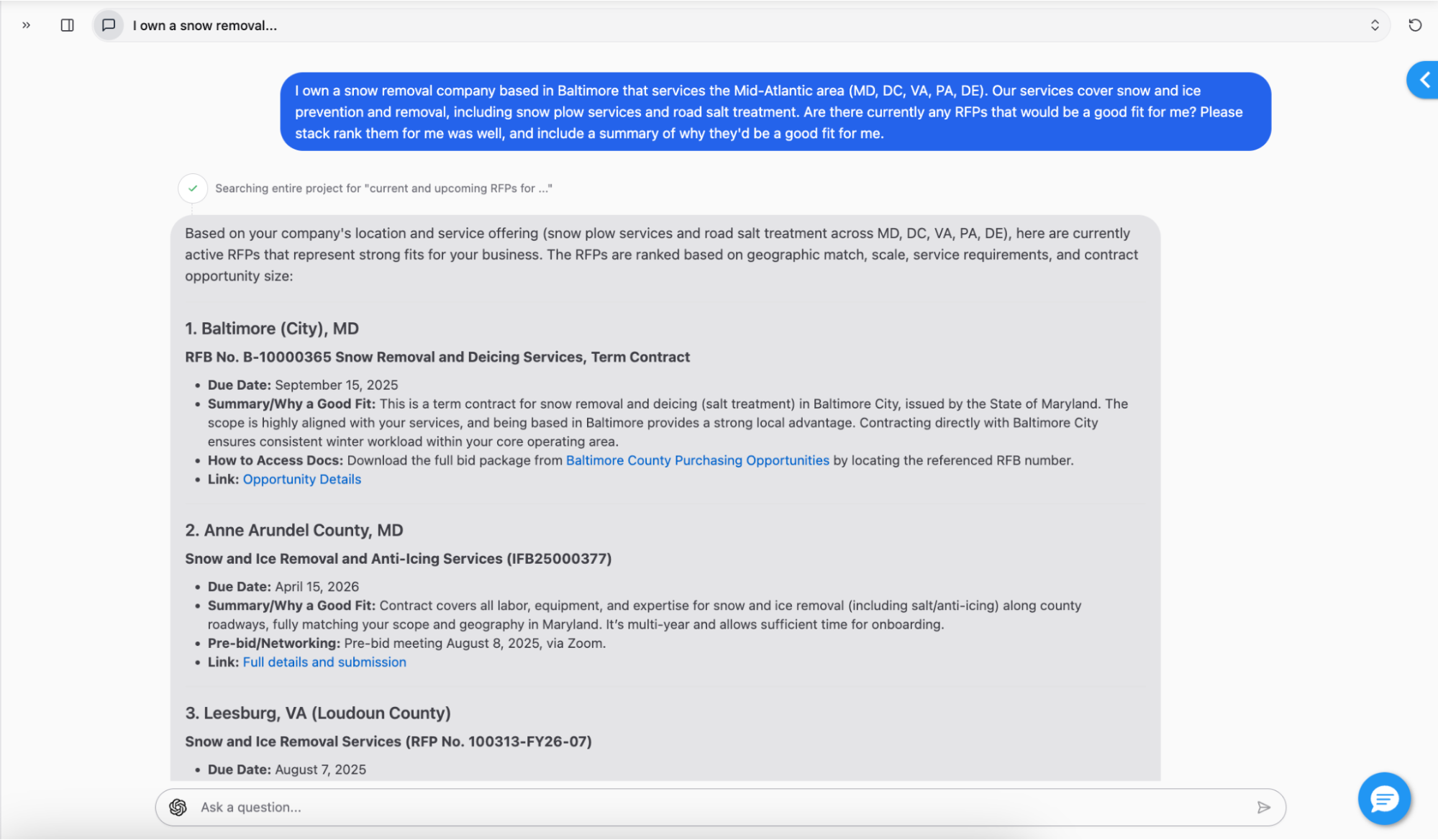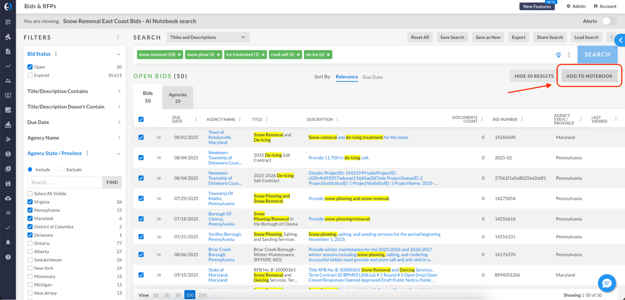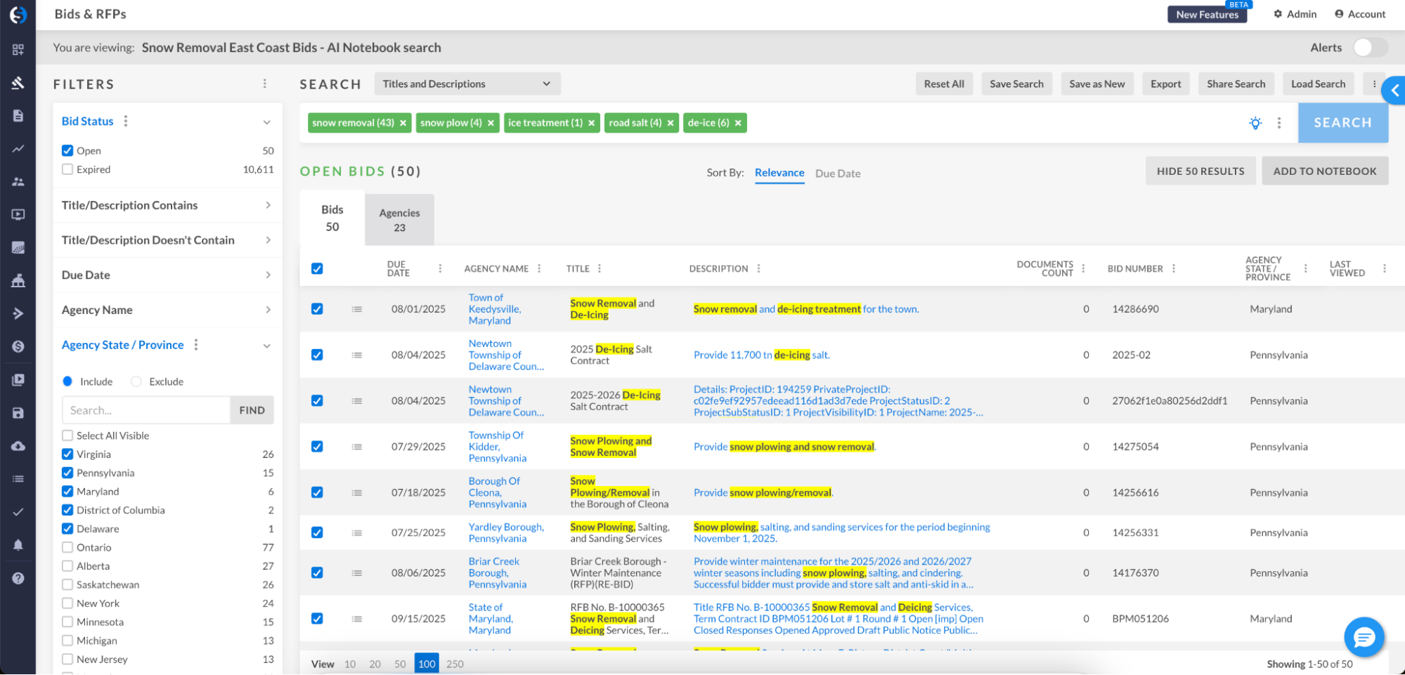 Example: A snow services contractor based in Baltimore could prioritize long-term contracts from nearby counties. Notebook would highlight bids that: