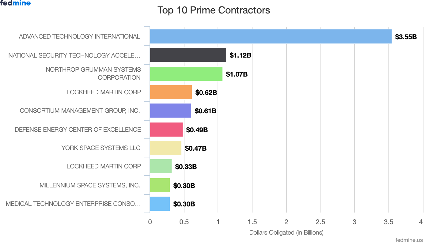 In terms of companies winning these awards, we see a mix of large primes such as Northrop Grumman and Lockheed Martin, along with consortiums such as ATI, National Security Technology Accelerator, and the Consortium Management Group, who help manage the projects.