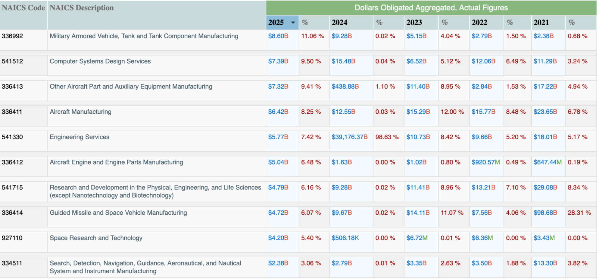 Because subcontracting data is self-reported, it should be interpreted with caution, and broad trends can be difficult to validate. Reported subcontract values have fluctuated significantly, ranging from approximately $348B in FY21 to $77.8B in FY25.
