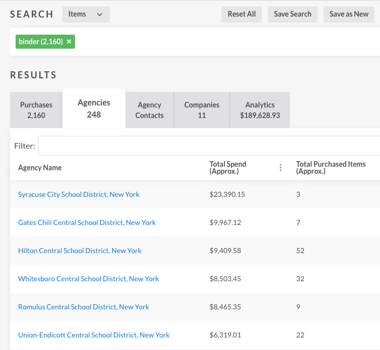 Let’s say you’re a sales rep for an office supplies company that primarily focuses on K-12 schools in the Northeast. Using historical spending data for school districts in New York state, you discover that many of these districts are overpaying for binders they purchase from a large, well-established reseller. By narrowing your focus on these districts, you have built yourself a strong pipeline of new opportunities.