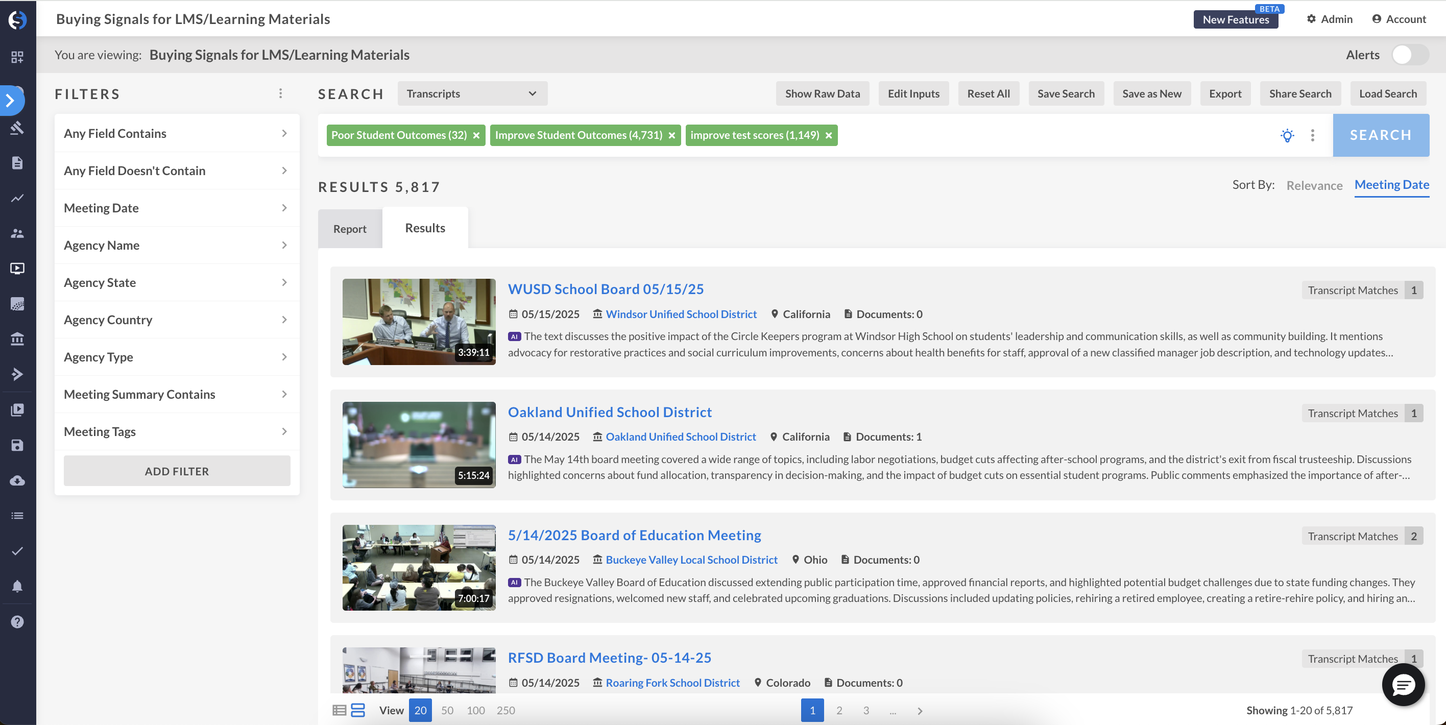 With Meeting Intelligence, GovSpend lets you search school board meeting transcripts for real-time conversations about student outcomes, budgeting for new tools, safety concerns, grant approvals, tech expansion, or new school construction. Hearing what’s being prioritized helps you align your message—and your timing—before RFPs are ever written.
