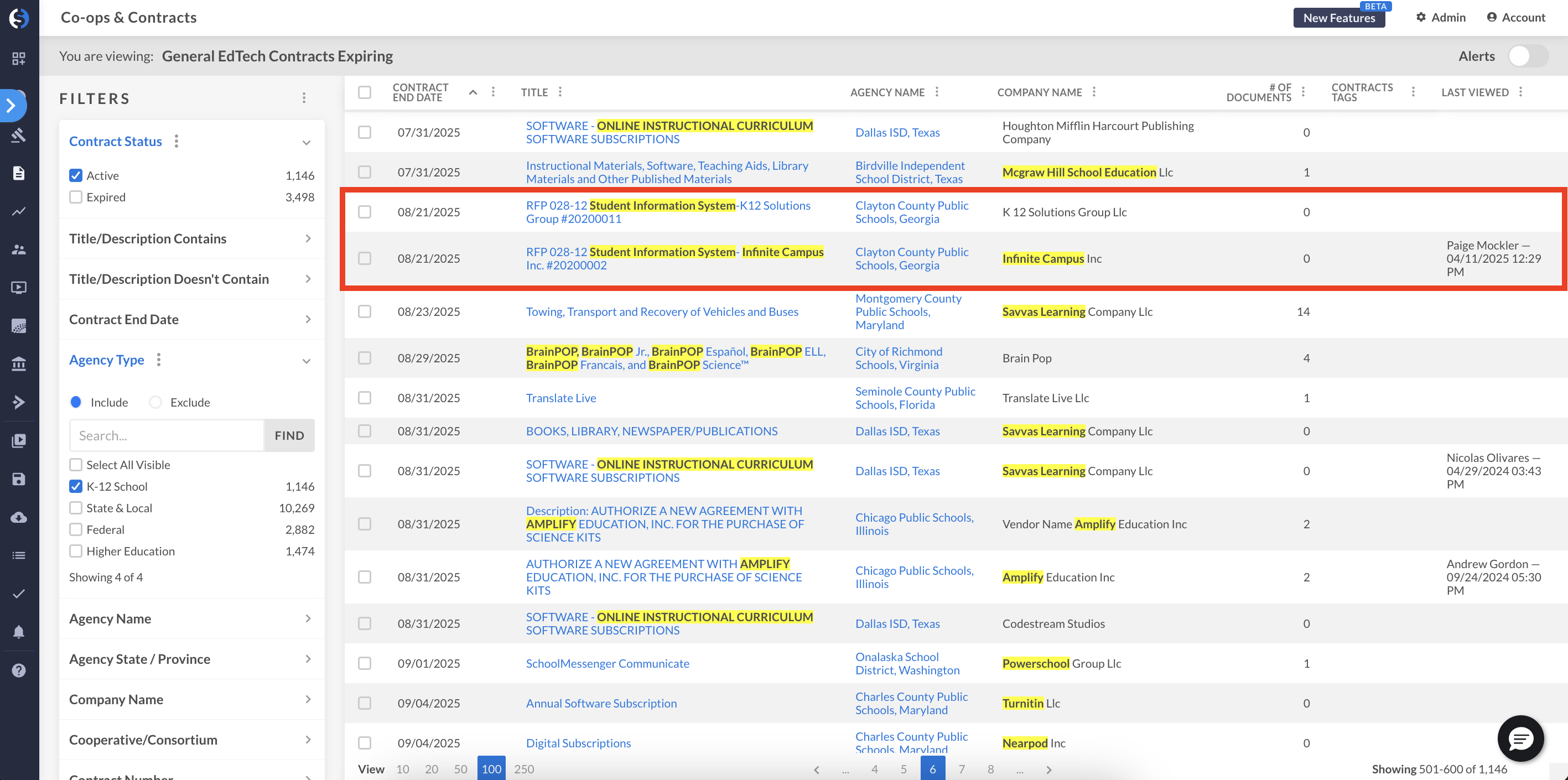 Knowing when contracts expire helps you start the conversation early—months before a formal bid. Paige showed how to search for expiring contracts within the next 6–12 months and layer in decision-maker contacts for highly targeted outreach. For instance, Clayton County Public Schools has a SIS contract expiring in August. Vendors who engaged with them in February would have the advantage.
