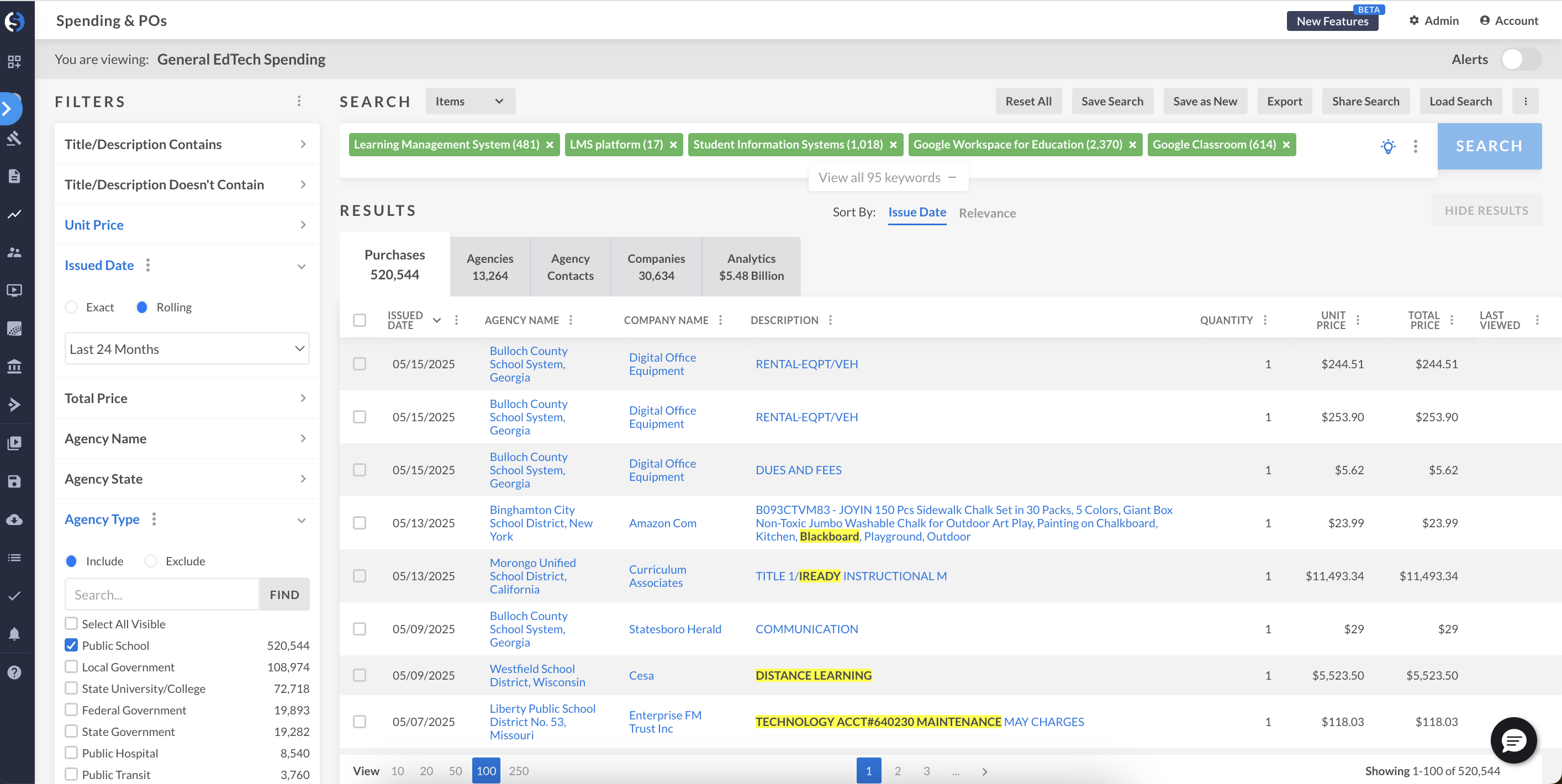 Skip cold searching. Instead, set up smart filters that track bids, contracts, and spending activity tailored to your solution—whether that’s student information systems (SIS), learning management platforms, or classroom technology. For example, Paige demonstrated a search using 95 EdTech-related keywords, producing over 150 open opportunities specifically in K–12.