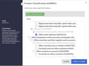 We expanded our implementation of AI to categorize all purchase order line items with the industry-standard UNSPSC Code system (product/service categorization system). This enhancement in Spending streamlines the search process through: