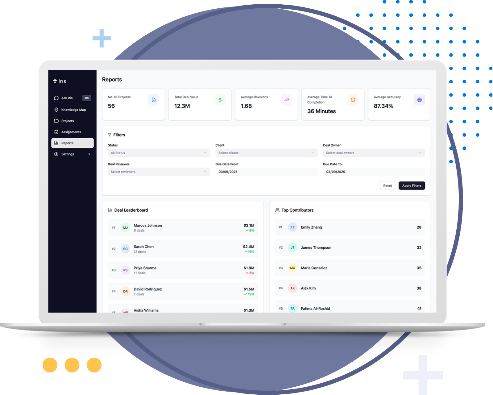 Iris is a secure, AI-first RFP automation tool that helps businesses streamline their bid response process. Unlike traditional response tools that rely on rigid answer banks, Iris dynamically pulls from documentation, ensuring accurate, real-time responses without requiring extensive manual upkeep. While your competitors are likely spending dozens of man-hours assembling proposals, Iris’s intuitive platform can produce a custom, polished response within a few hours and adjust per your direction.