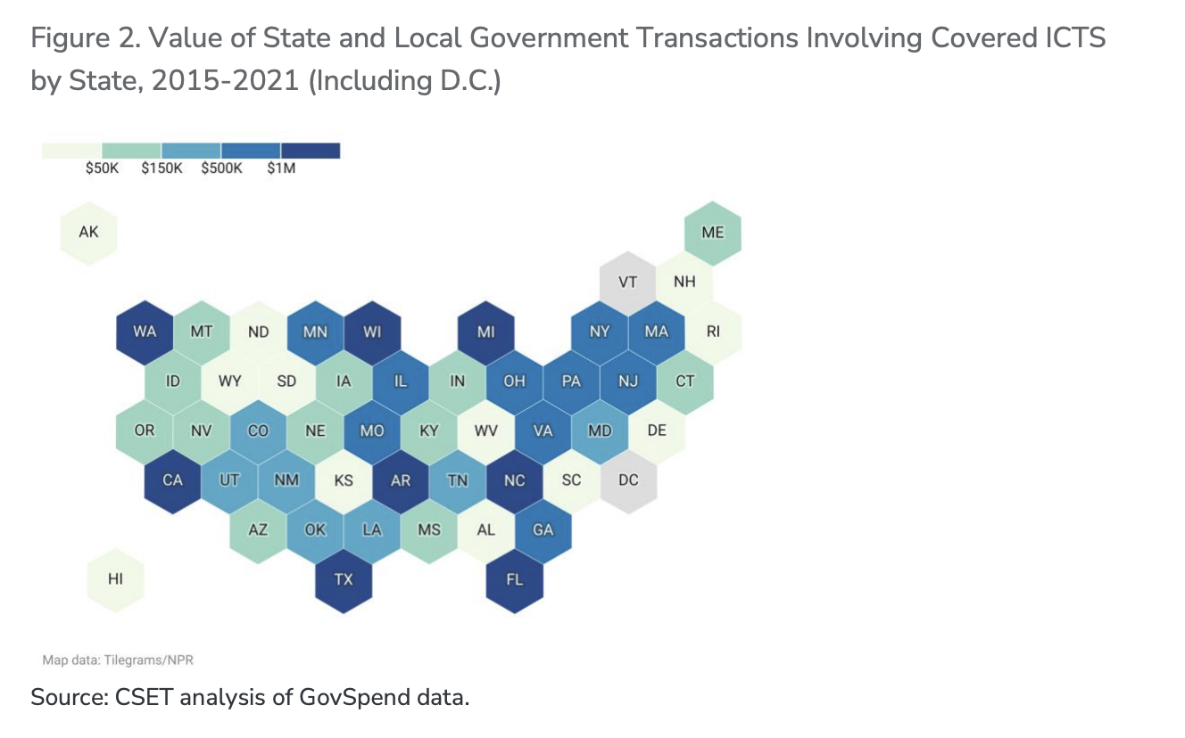 Between 2015 and 2021, at least 1,681 state and local governments purchased equipment and services tied to the five companies named in Section 889. Every state except Vermont had at least one state or local government entity procure ICTS covered under Section 889 (there were also no purchases in Washington, D.C.). Collectively, these entities conducted nearly 5,700 transactions involving a wide range of covered equipment including but not limited to smartphones, surveillance cameras, temperature scanners, handheld radios, and networking equipment.50 Figures 1 and 2 show the total number and value of government transactions that involved equipment from Huawei, ZTE, Hikvision, Dahua, and Hytera in each state. Our analysis relies on data provided by GovSpend, a company that tracks federal, state, and local government procurement.